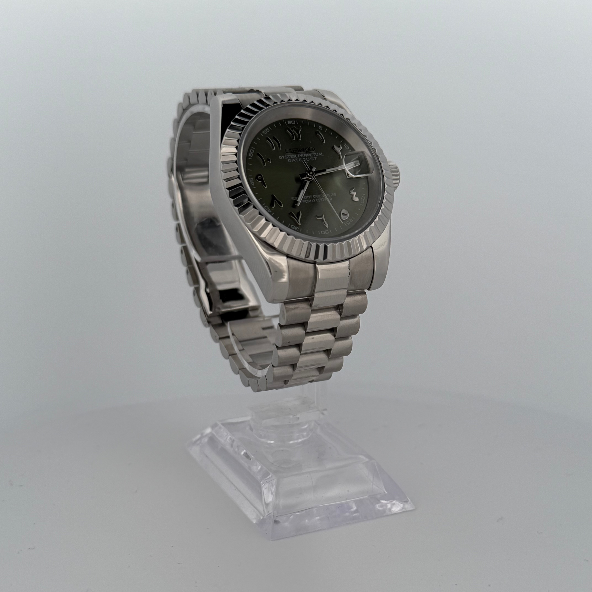 The Olive Arabic Dial Mod is powered by the authentic NH35 movement. It is cased with the highest quality of 904L Surgical Stainless bracelet, and premium quality sapphire crystal which comes with a Date Magnifier.